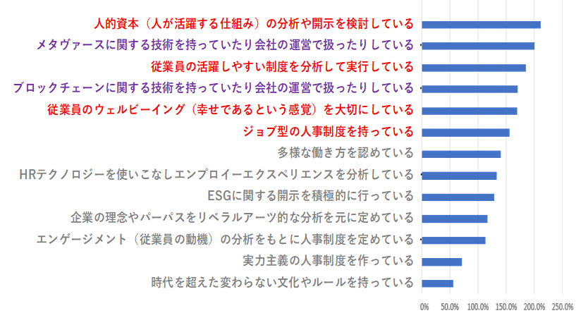 ①人的資本を整備する等、人の活躍の工夫が最も「先進的」な度合い(存在数に対するイメージの高さの割合)が高く、メタヴァースやブロックチェーンなどの技術導入が次順位である
