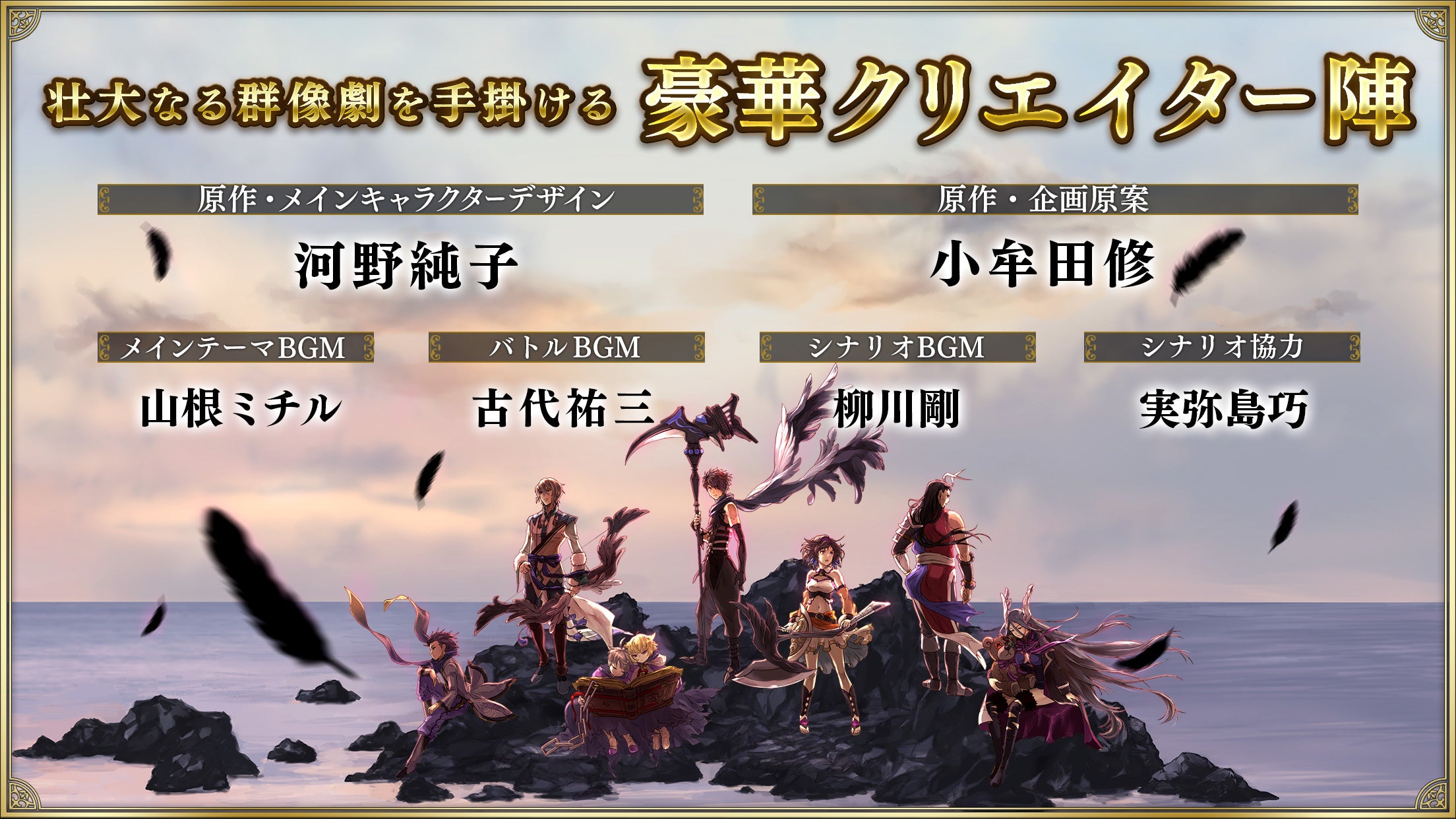 本作は「破壊」と「創造」をテーマに、主人公(破壊者)と仲間たちが活躍する本格群像劇RPGです。原作・メインキャラクターデザインに河野純子氏、原作・企画原案に小牟田修氏、メインテーマに山根ミチル氏、バトルBGMに古代祐三氏、シナリオBGMに柳川剛氏、シナリオ協力に実弥島巧氏と豪華クリエイター陣を起用したタイトルとなっております。