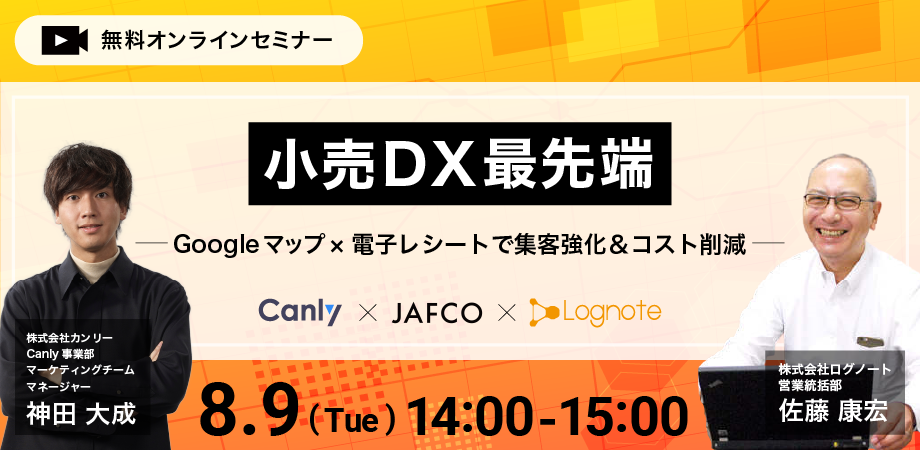 Googleビジネスプロフィール・HP・各SNSの一括管理サービス「Canly(カンリー)」を提供する株式会社カンリーと、電子レシートプラットフォーム「iReceipt」を提供する株式会社ログノート、この2社が、大手チェーン企業の事例をモデルケースに小売業DXのトレンドに関して徹底解説します。