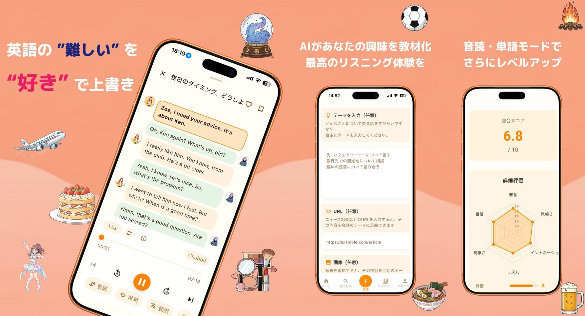 「もし、自分の大好きな趣味や、今知りたいニュースがそのまま教材になったら?」 Chabbitは、そんな発想から生まれた、挫折させないためのリスニングアプリです。
