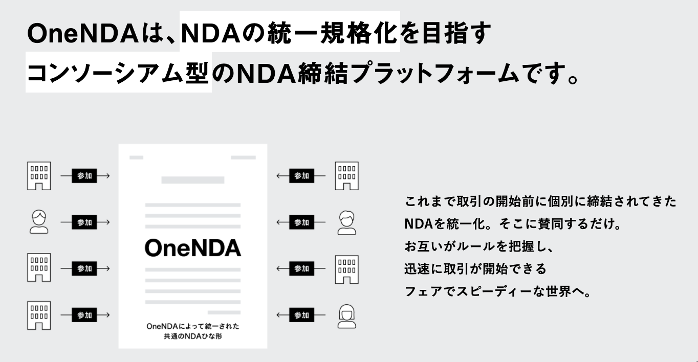 「OneNDA」は、NDAの統一規格化を目指すコンソーシアム型のNDA締結プラットフォームです。