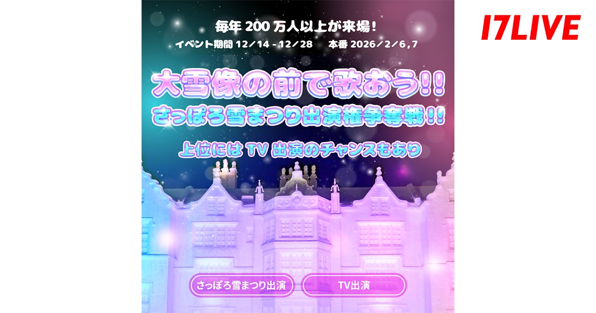 17LIVE株式会社(東京都渋谷区、代表取締役:ジャン・ホンフイ、URL:https://jp.17.live/)が運営する日本最大級のライブ配信アプリ「17LIVE(イチナナ)」は、北海道札幌市で毎年開催している冬の一大イベント“さっぽろ雪まつり”に出演するライバーを決定するオーディションイベント、『大雪像の前で歌おう!!さっぽろ雪まつり出演権争奪戦!!』を、2025年12月14日(日)より開催することが決定しましたので、お知らせいたします。