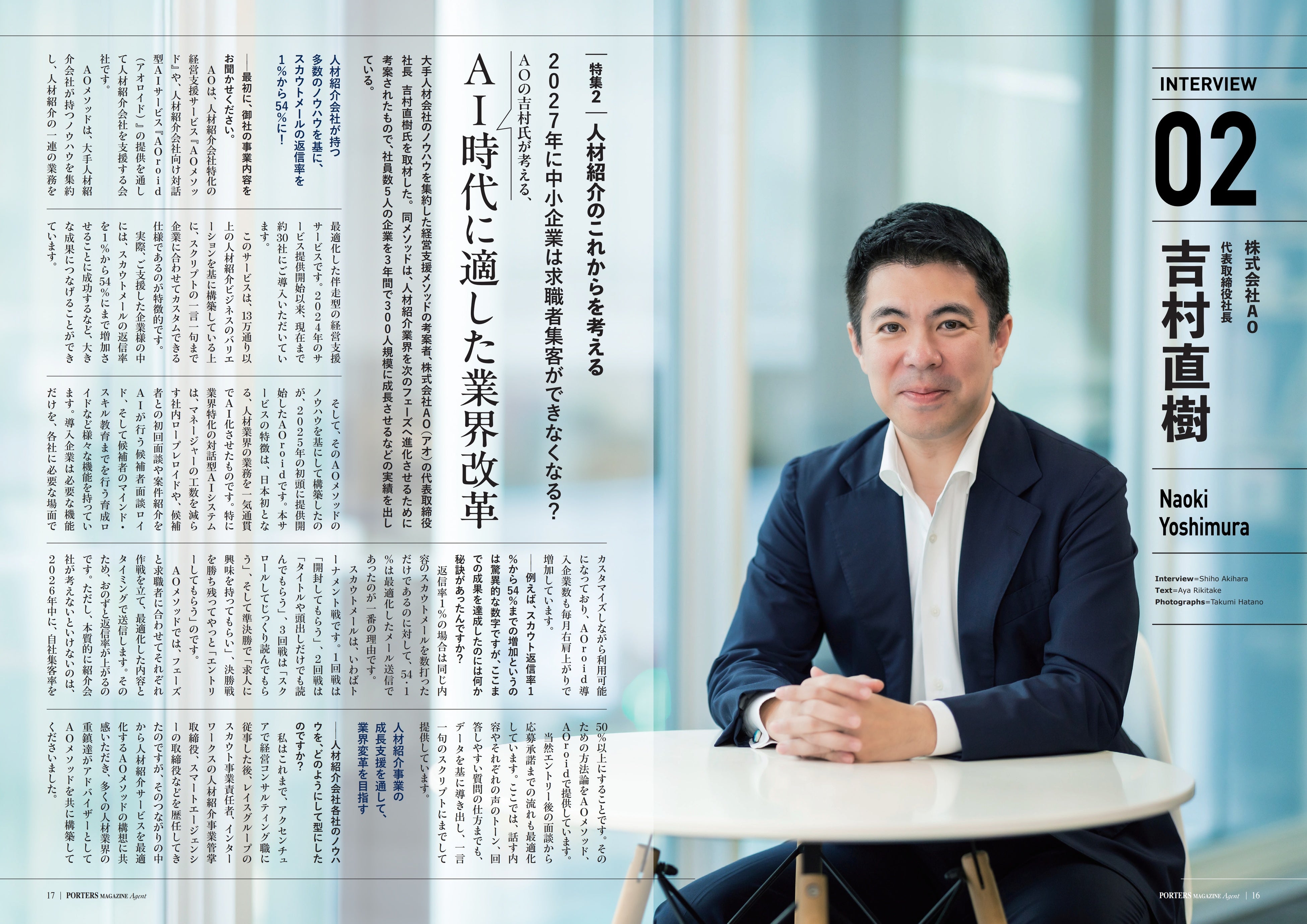 人材紹介会社特化の経営支援・AIシステム開発を行う株式会社AO(本社:東京都中央区、代表取締役:吉村 直樹、以下AO)は、人材業界のリーディングメディア『PORTERS MAGAZINE(ポーターズマガジン)』最新号の特集「人材紹介のこれからを考える」に選出され、代表吉村のインタビュー記事が掲載されたことをお知らせいたします。