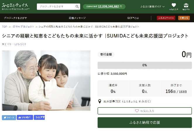 - 「シニアの経験と知恵をこどもたちの未来に活かす ~SUMIDAこども未来応援団プロジェクト~」は、「朗読」と「遊び」を軸としたシニアと子どもの交流事業の実施に使用します。