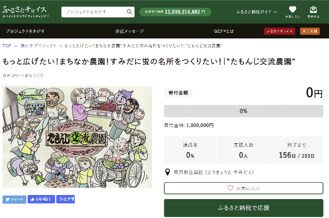 - 「~もっと広げたい!まちなか農園!!すみだに蛍の名所をつくりたい!~“たもんじ交流農園”」プロジェクトは、まちなか農園内での蛍の自然育成のため、自然エネルギーを中心とした水循環システムの構築等に使用します。