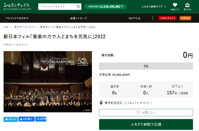 - 「新日本フィル『音楽の力で人とまちを元気に』2022」プロジェクトは、コンサートの実施や井上道義氏作ミュージカルオペラの制作、小澤征爾氏をはじめとする過去の演奏録音アーカイブの作成等に使用します。