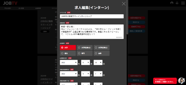 また、JOBTVをご利用いただいている企業様の中からも「面接などの選考の数時間で学生と接するよりも、インターンシップで数日間濃厚な時間を過ごす方が、学生を見抜くことができる」「ルール見直しもあり、インターンシップを強化したい。インターンシップの選考もより効率的に行う必要がある」などの声を多く聞きました。