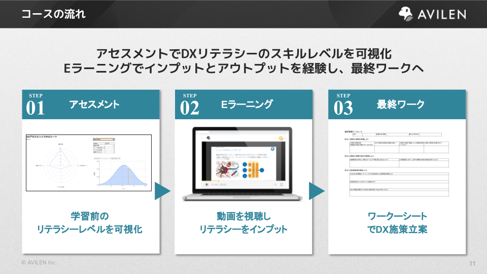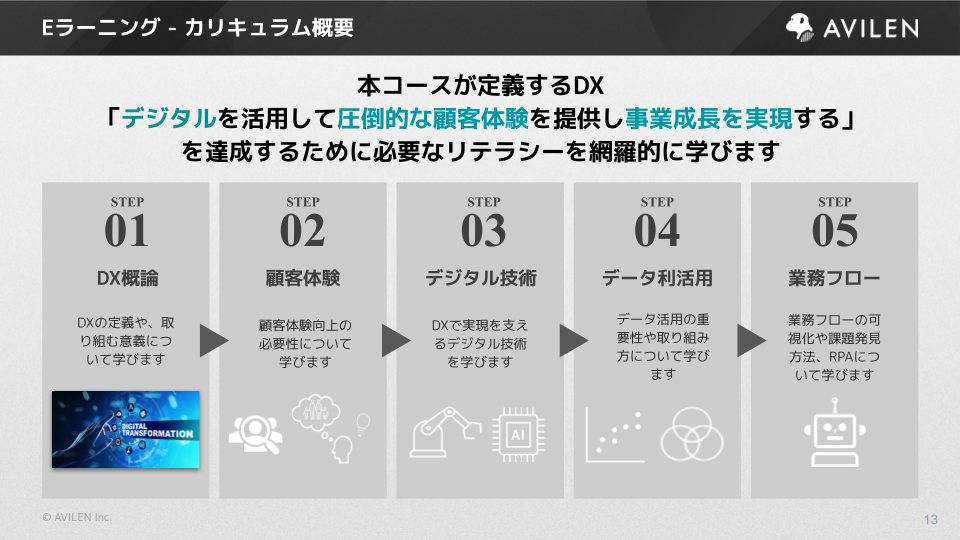 AVILENが掲げるDXの定義は、「デジタルを活用して圧倒的な顧客体験を提供し、事業成長を実現すること」です。このDXを実現するための必要最低限の素養を身に付けていただくためのカリキュラムとなっております。