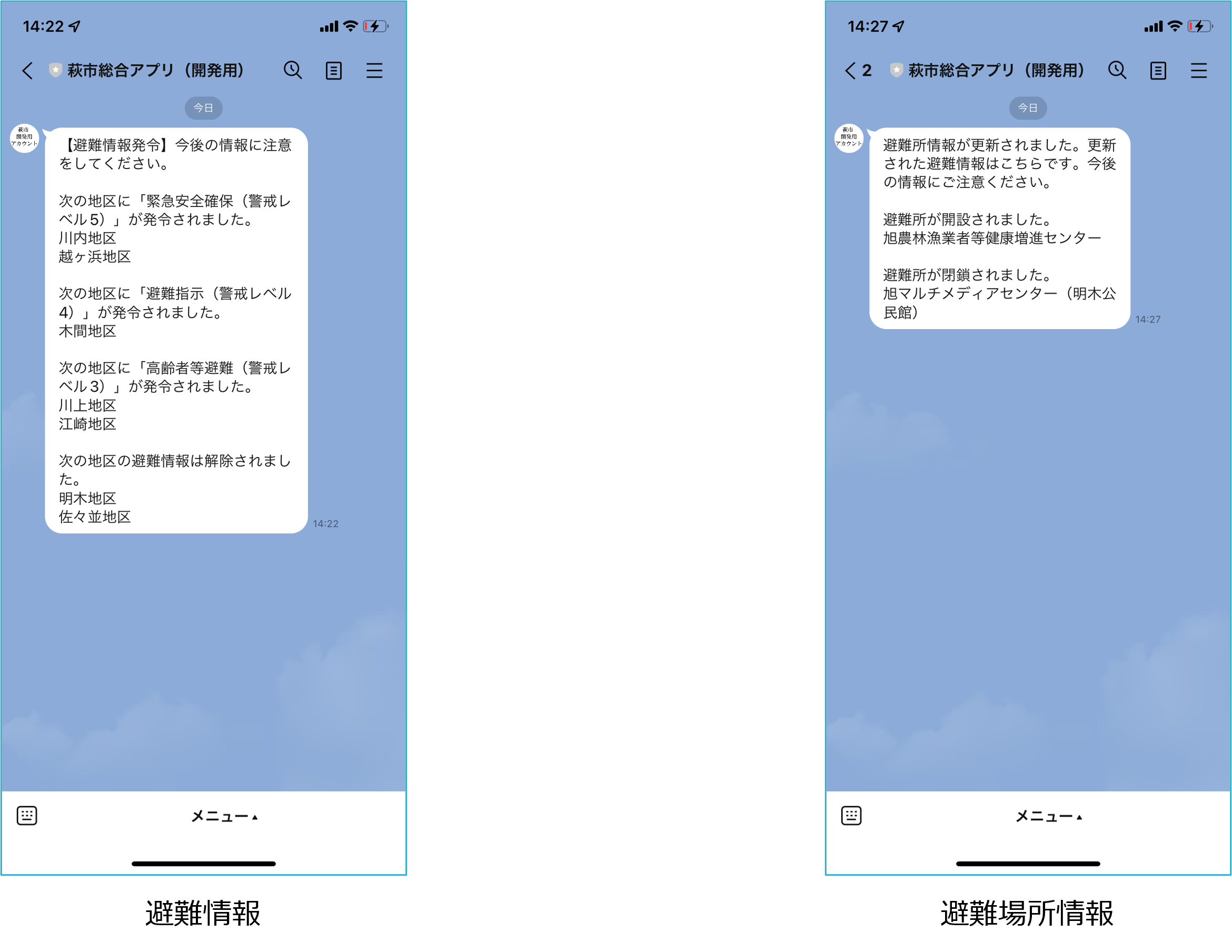 防災システムで避難情報や避難場所開設等の情報が発令されると、それらの情報を「はぎなび」を経由してLINE上で通知します。萩市民は取得したい地域情報の受信設定をしておくことで、必要な情報を受けとることができます。
