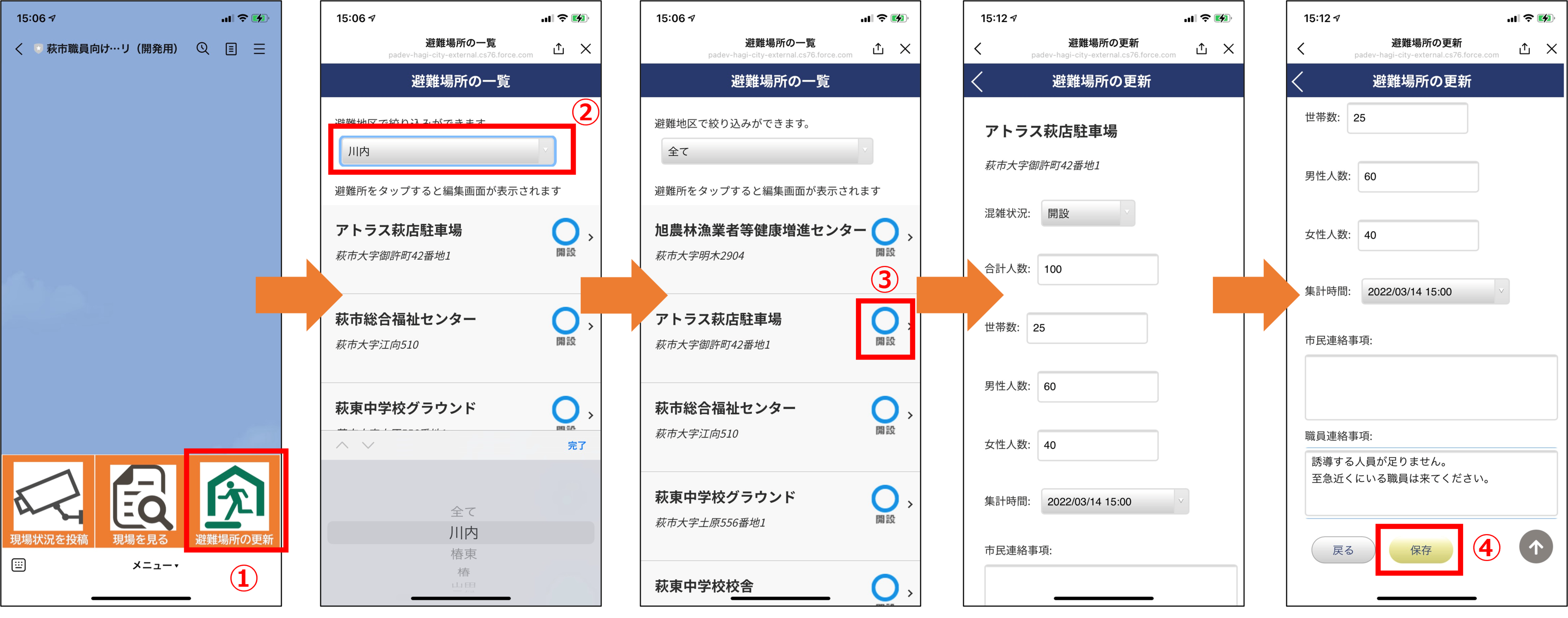 避難場所状況更新画面イメージ(萩市職員のスマートフォン画面)