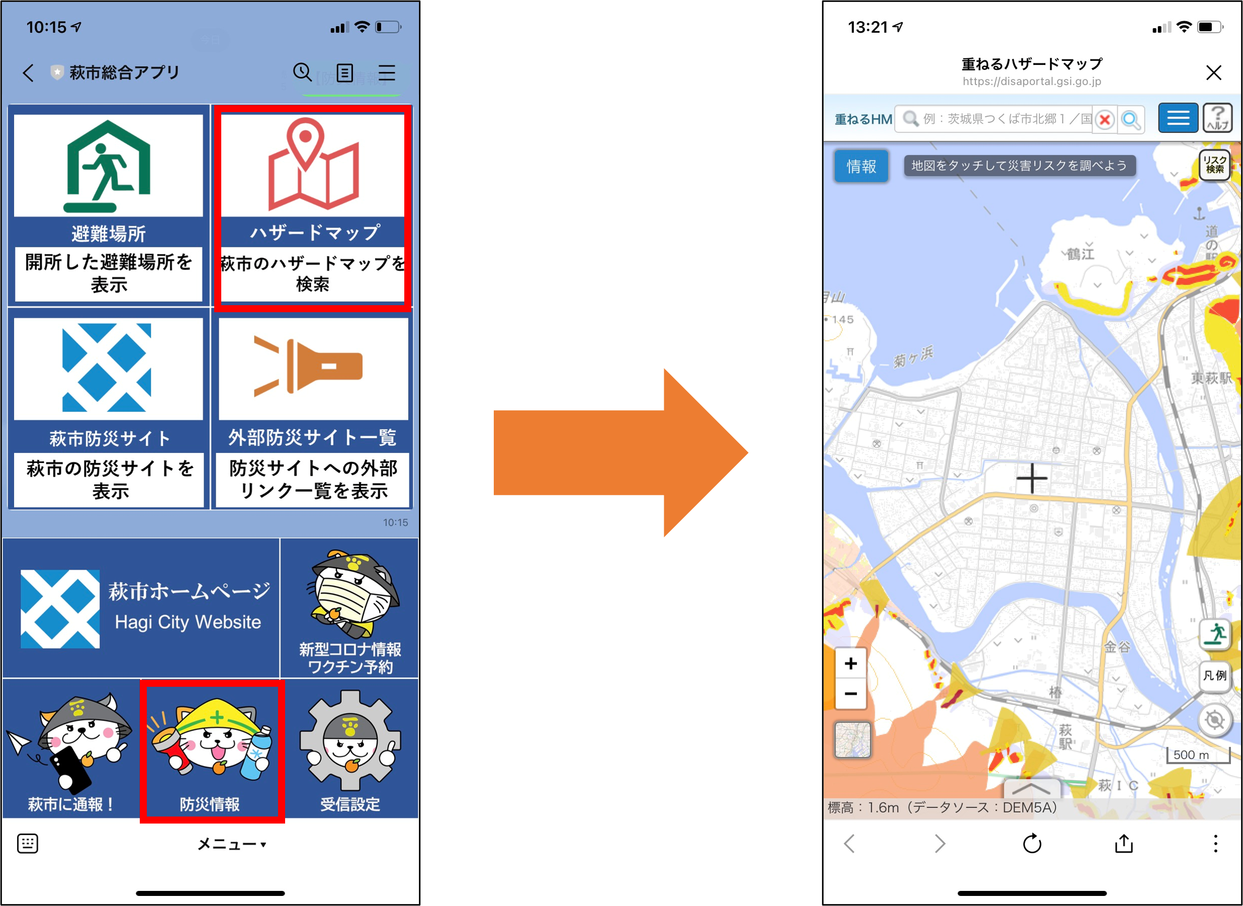 ハザードマップ画面イメージ(萩市民のスマートフォン画面)