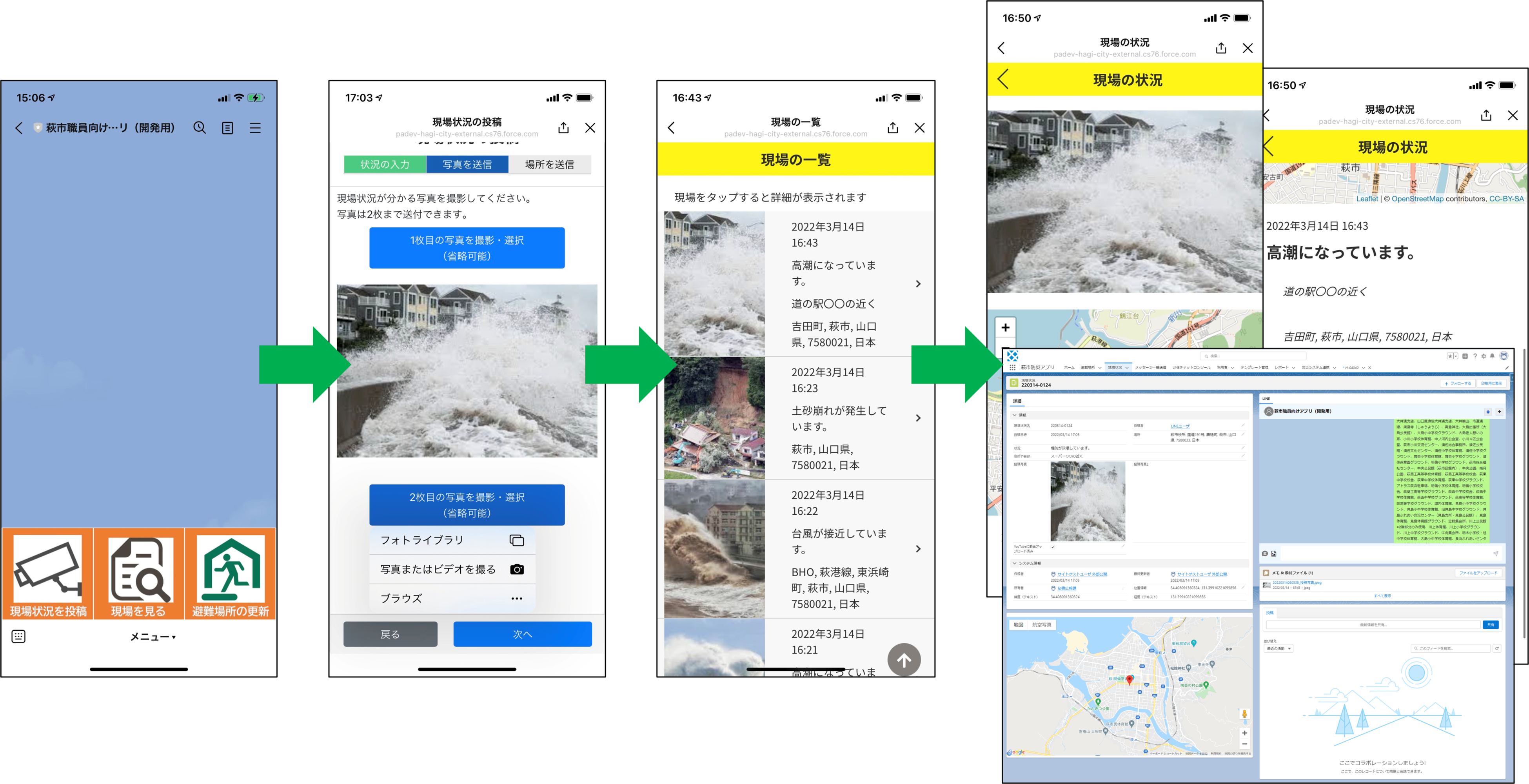 萩市職員が、災害発生現場の状況をスマートフォンで投稿して、それを職員内で共有して災害対策に活かすことができます。投稿された情報は、スマートフォンだけでなくPCのSalesforce画面上でも確認ができるため、防災システムの情報と合わせて確認することが可能です。