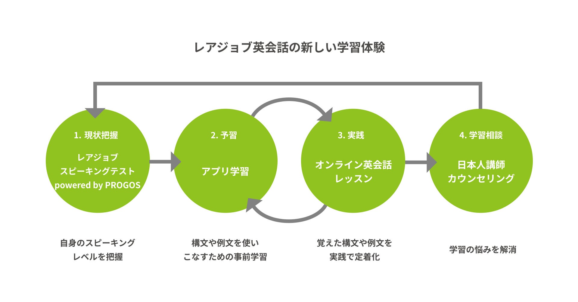 そこで、この度レアジョブでは従来の提供プランを大幅にアップデートし、継続的に学習することで英会話力が高まるサービス、そして、グローバルで活躍できるような英会話力を日本人1,000万人が身につけられるサービスとして、新プランを提供することにいたしました。効果的かつ効率的な英語学習に欠かせない学習サイクルに基づく機能・体験を拡充し、求める英会話力習得までの道のりを、迷わず進める《新しい学習体験》の提供へと踏み出します。