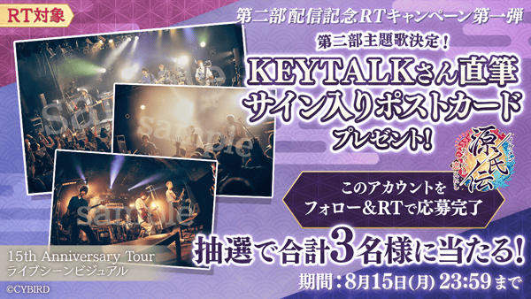 『イケメン源氏伝 あやかし恋えにし』公式Twitter(https://twitter.com/ikemen_genjiden)をフォローのうえ、対象ツイートをRTしていただいた方の中から抽選で3名様に「KEYTALKさん直筆サイン入りポストカード」をプレゼントします。