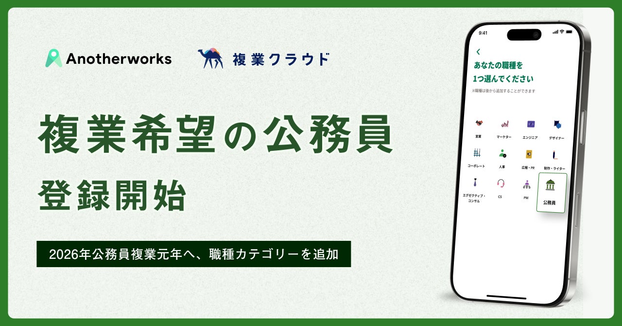 複業したい個人と企業や自治体を繋ぐ、複業マッチングプラットフォーム「複業クラウド」を運営する株式会社Another works(本社:東京都港区、代表取締役:大林 尚朝)は、2025年12月、登録できる職種に「公務員」を追加し、複業を希望する公務員の登録受付を開始しました。