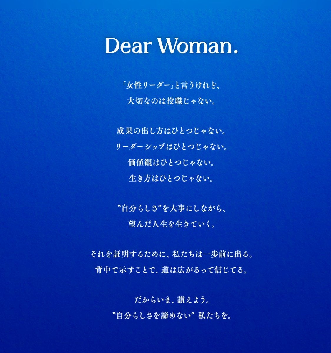『Dear Woman.』では、現在活躍している女性たちの中で、自ら新しいリーダーシップの姿を体現している方、そういった女性たちをサポートしている方、新たな考え方を発信している方、次世代をリードされている様々な女性リーダーをご紹介する、女性のためのエンパワーメントプロジェクトです。