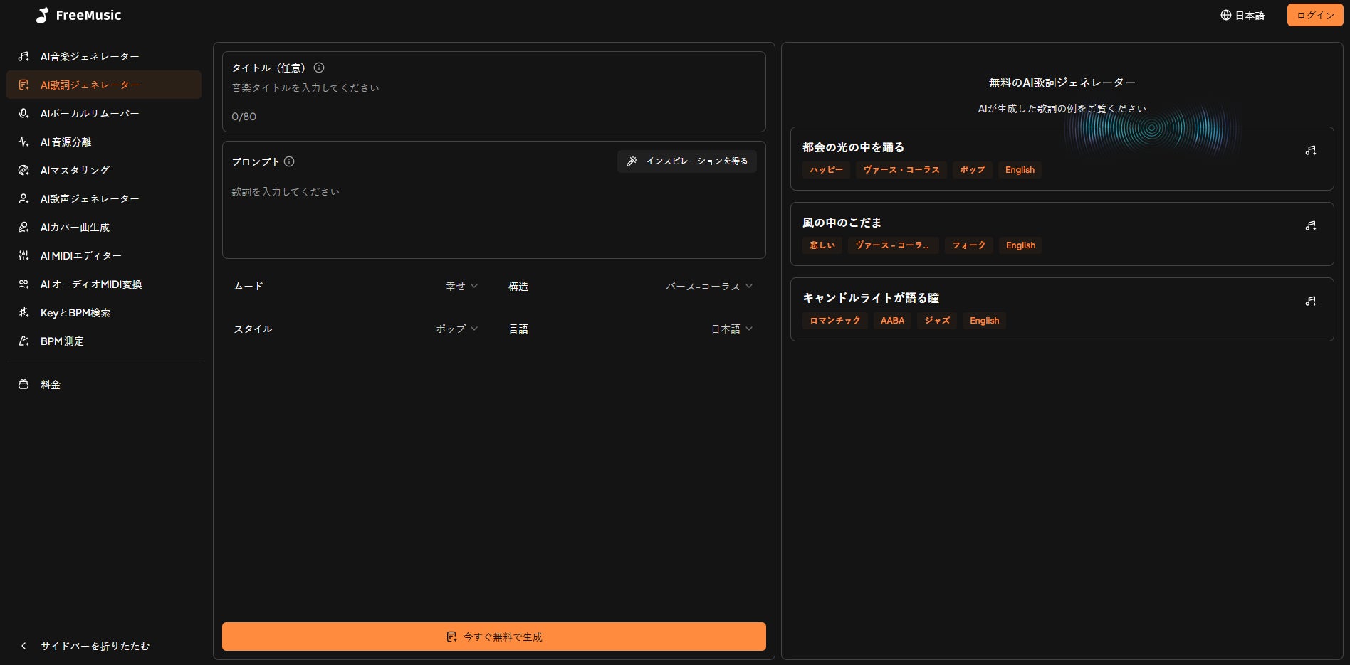 「Freemusic AI」のAI音楽生成エンジンは、ユーザーが入力した「気分」「ジャンル」「スタイル」のテキストプロンプトを高度に解釈し、わずか数秒でフル楽曲を構築します。