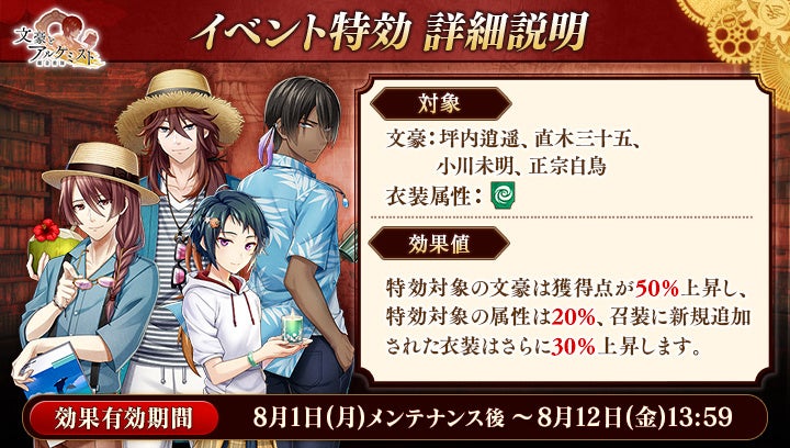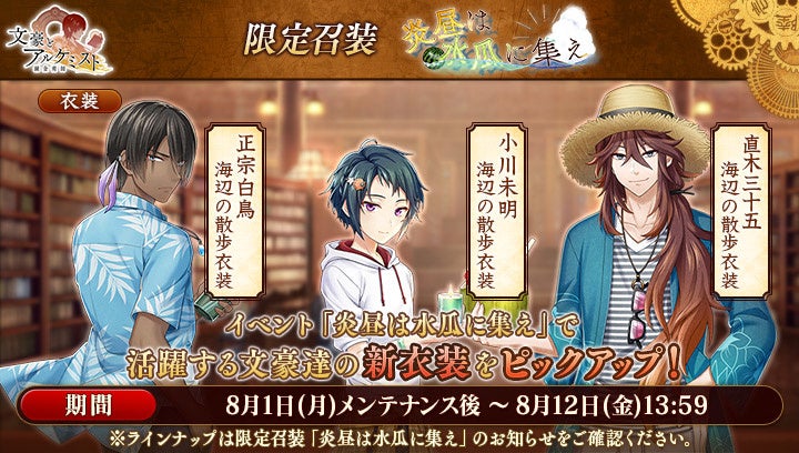 さらに、イベントと同時に開催される限定召装『炎昼は水瓜に集え』にて新規追加された「直木三十五」「小川未明」「正宗白鳥」の〈海辺の散歩衣装〉を編成すると、得点の獲得率がそれぞれ30%上昇します。