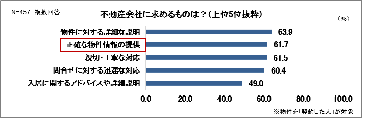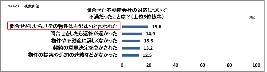 物件広告の掲載における違反理由として”確認不足” や“入力ミス”等の人的ミスがある一方、”ルールそのものを知らなかった”ケースも存在します。そんな中、お部屋探しをするユーザーが不動産会社に求めるものとして不動産情報サイト事業者連絡協議会(RSC)「不動産情報サイト利用者意識アンケート」調査結果によると「正確な物件情報の提供」が2番目に求められています。(図1参照)不動産会社の対応について不満だった事については「問合せをしたら、その物件はもうないと言われた」の項目が第1位となっています。(図2参照)これらの調査結果からも、ユーザーはお部屋探しの際に正確な物件情報を求めている事が分かります。