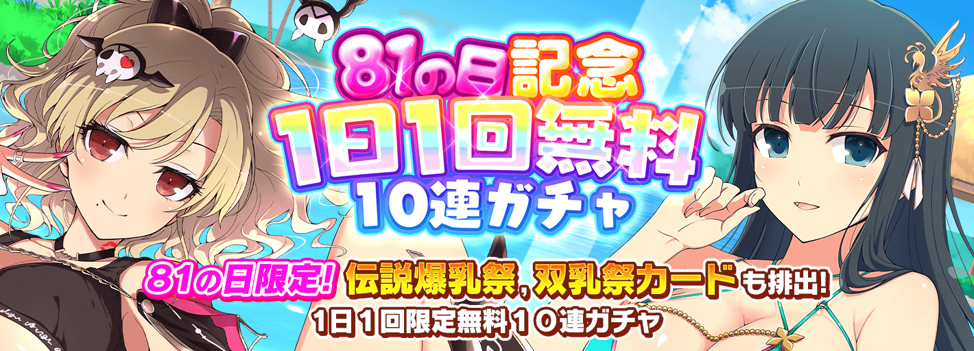 【「81の日記念!爆乳祭1日1回無料10連ガチャ」 開催期間】:8/2(火)4:00~8/8(月)3:59まで