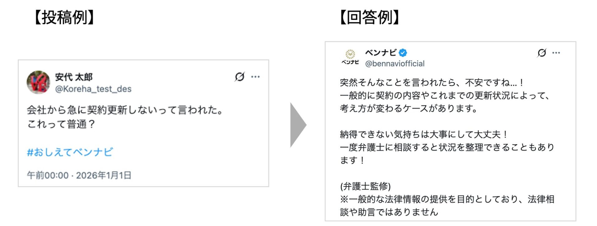 本キャンペーンは、X上でユーザーが「#おしえてベンナビ」とハッシュタグを付与して投稿した内容の中から、審査の上で選定したツイートに対して、ベンナビ公式アカウント(@bennaviofficial)が、弁護士監修のもと、一般的な法制度の考え方や知識・情報を発信するものとなります。