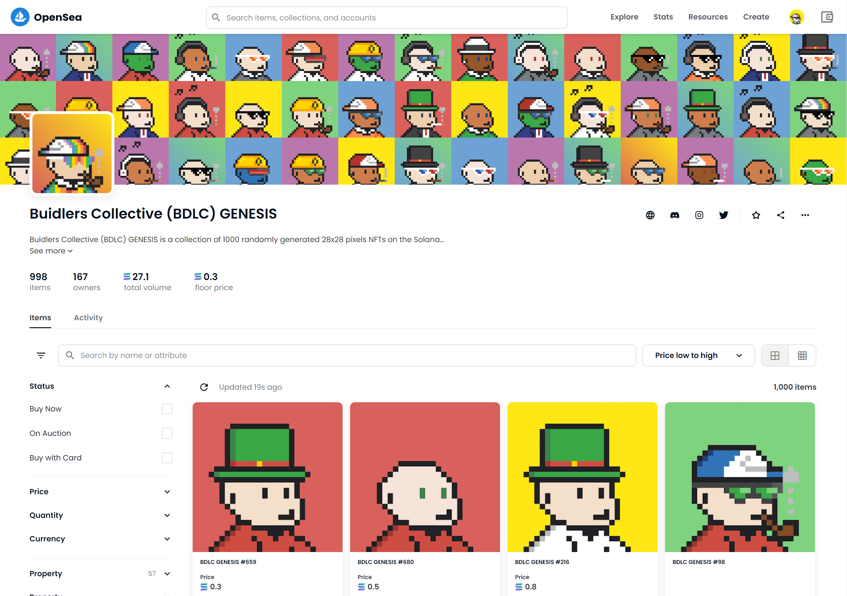 Buidlers Collective (BDLC) GENESIS は、Solana ブロックチェーン上でランダムに生成された 1000 個の 28×28 ピクセル NFT コレクションです。各 Buidler はユニークであり、希少性の異なるさまざまなタイプと属性が付与されています。