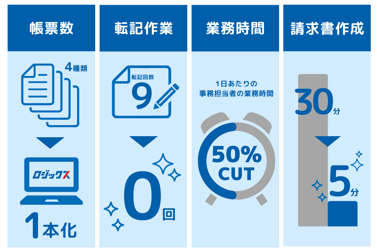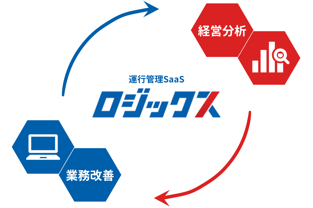 ロジックスは、「シングルインプット・マルチアウトプット」という特性を持ち、配車計画の作成から、段階に応じてステークホルダーごとに必要な書類の出力作業から請求書の作成という、ビジネスの入りから終わりまでの工程を一気通貫でカバーすることで、運送業者の現場からアナログな多重入力を削ぎ落とします。また、ロジックスを活用して業務を行うと、必要なデータが自然と一元集約されていくため、データ分析のための追加作業などが不要で、収支改善につながる経営数値(運賃・積載率等)を、特別な工数を割くことなしに容易に可視化することが可能です。