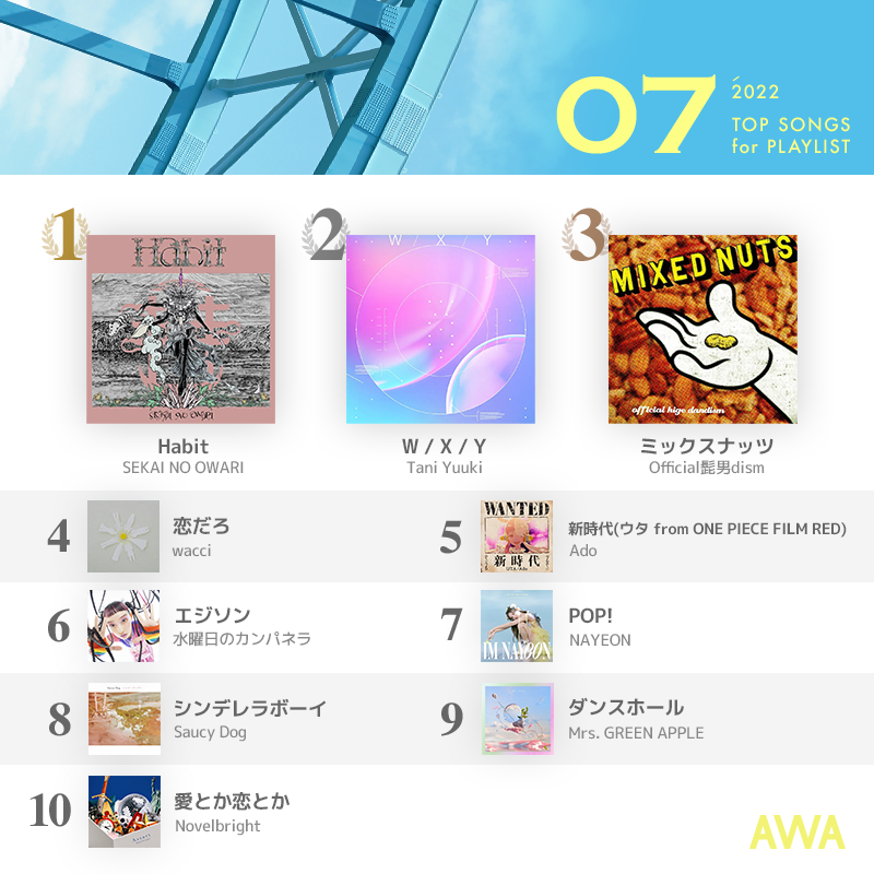 2022年7月度は、蜷川実花監督作品の映画『ホリック xxxHOLiC』主題歌の為に、SEKAI NO OWARIが書き下ろし、TikTokなどでもダンス動画が多数投稿されている「Habit」が、見事3ヵ月連続で1位に輝きました。2位には、先月3位だったこちらもTikTokでロングヒットを続けているTani Yuuki「W / X / Y」が獲得。3位には、大人気を博しているTVアニメ『SPY×FAMILY』オープニング主題歌に起用された、Official髭男dismの「ミックスナッツ」が輝いています。