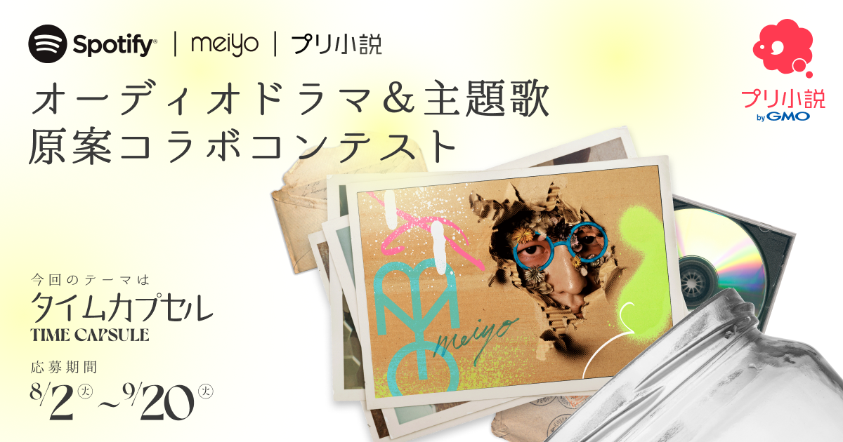 コラボ企画は、「第34回プリコン」として『タイムカプセル』をテーマにした小説作品のコンテストを開催し、「meiyo」本人が作品の審査に参加します。2022年8月2日(火)から9月20日(火)までの期間にご応募いただき、グランプリを獲得した小説作品は、オーディオストリーミングサービス「Spotify」で2023年に公開予定のオーディオドラマの原案に採用されます。また、作品をイメージした主題歌を「meiyo」が新たに書き下ろす予定です。