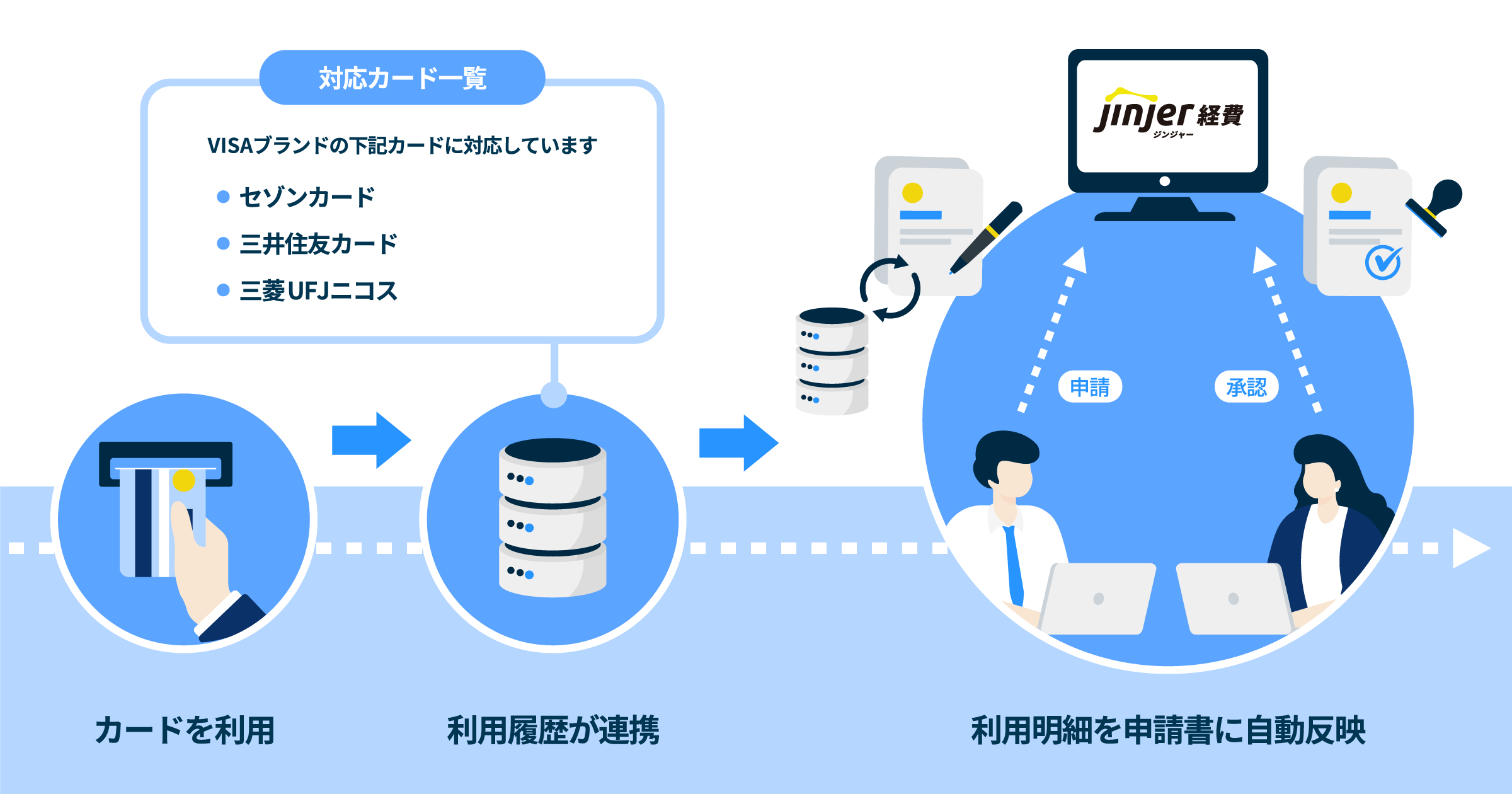 クレジットカード連携機能とは、クレジットカードの利用明細を経費精算システムへ自動反映することで、簡単かつ正確に経費精算を行うための入力補助機能です。申請者は、法人向けクレジットカードの利用履歴を事前に登録をしたクレジットカード毎の登録IDに基づいて呼び出すことで、経費精算明細に自動で利用履歴を取り込むことが可能となります。取り込まれたデータを用いて、経費精算業務をおこなうため、入力時間の削減や、入力ミスや申請漏れの防止にもつながります。また、管理者のメリットとして、法人向けクレジットカードの利用履歴を把握できるため、ガバナンスの強化を実現します。