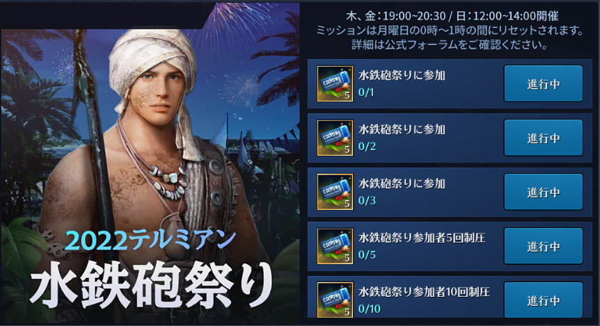 テルミアンで遊んで報酬が獲得できるミッションイベントや、テルミアンのイベント期間中の木/金曜日の19:00~20:30と日曜日の12:00~14:00には水鉄砲祭りが開催されます。