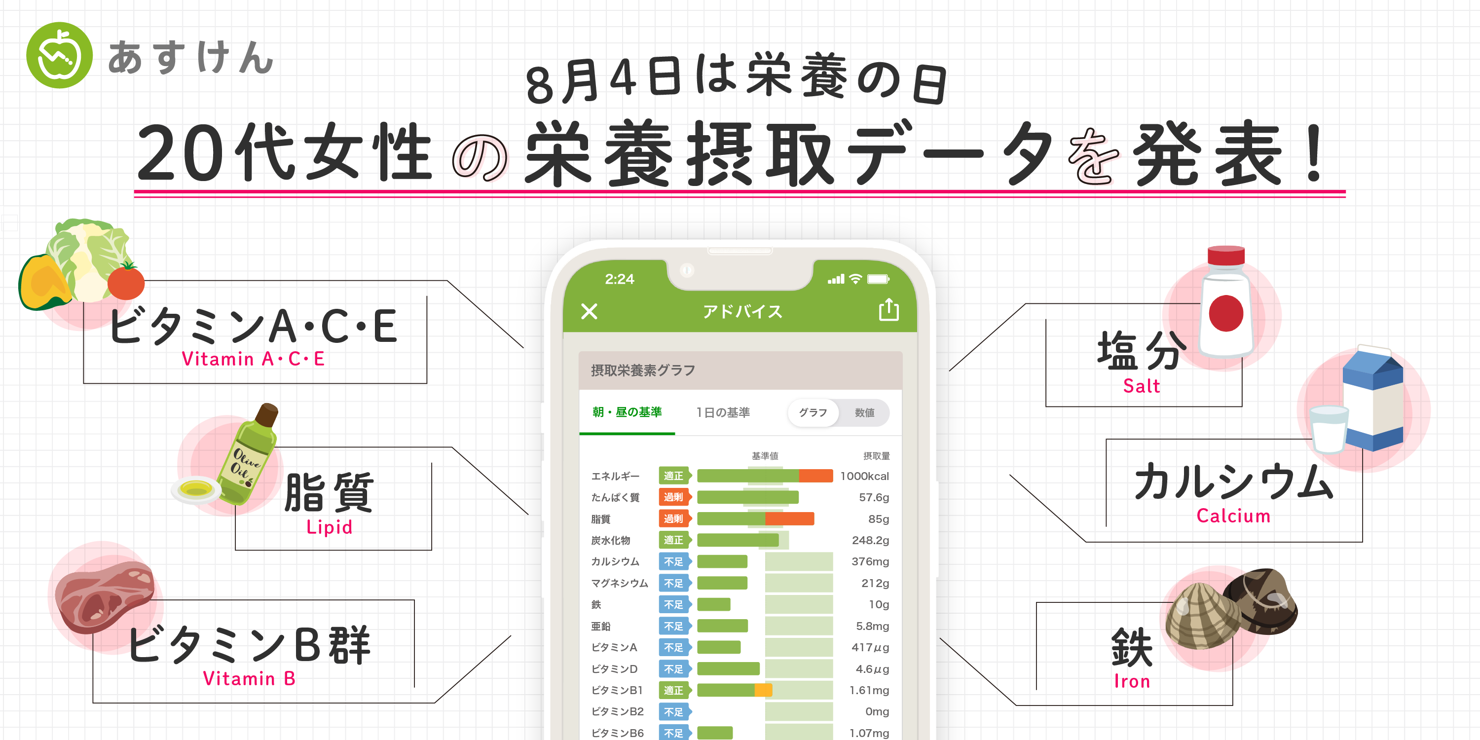 あすけんでは、8月4日の「栄養の日」に先立って行う本情報の発信などを通し、適正なエネルギー摂取や食事の「中身」である栄養バランスへの注目を高め、若い女性において「やせ」が多いことなどの社会的問題への関心を促し、その改善をサポートする取り組みを進めます。