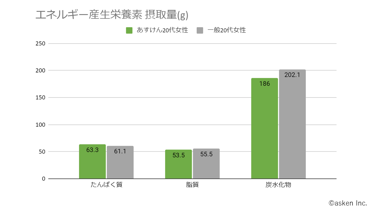 あすけん20代女性は一般20代女性よりも脂質と炭水化物を控えめにし、たんぱく質を多く摂っていました。