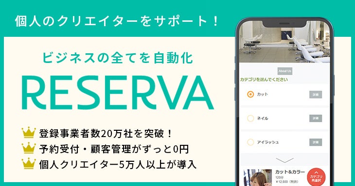 RESERVAは、美容・ヨガ・フィットネス・音楽・料理・キャリア・育児・占いなど350業種以上の個人商圏を最大化する支援を行っています。