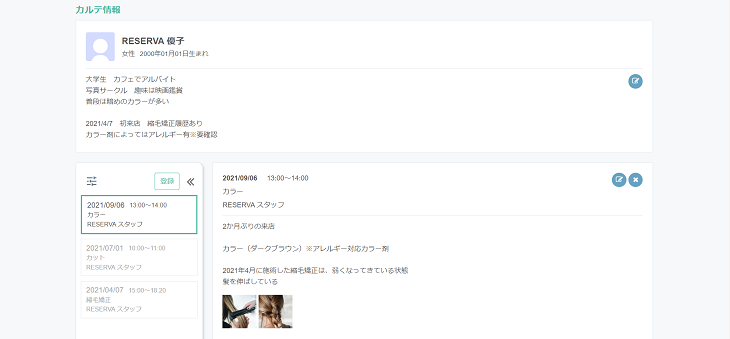 RESERVAのカルテ機能は、お客様の対応履歴やアレルギーに関する特記事項、担当したスタイリストのメモを記録できます。顧客情報の詳細画面では、過去の施術履歴が一覧で表示されるため、以前使用したカラーやトリートメントの種類、パーマの頻度など、これまでの施術内容をかんたんに把握することができます。