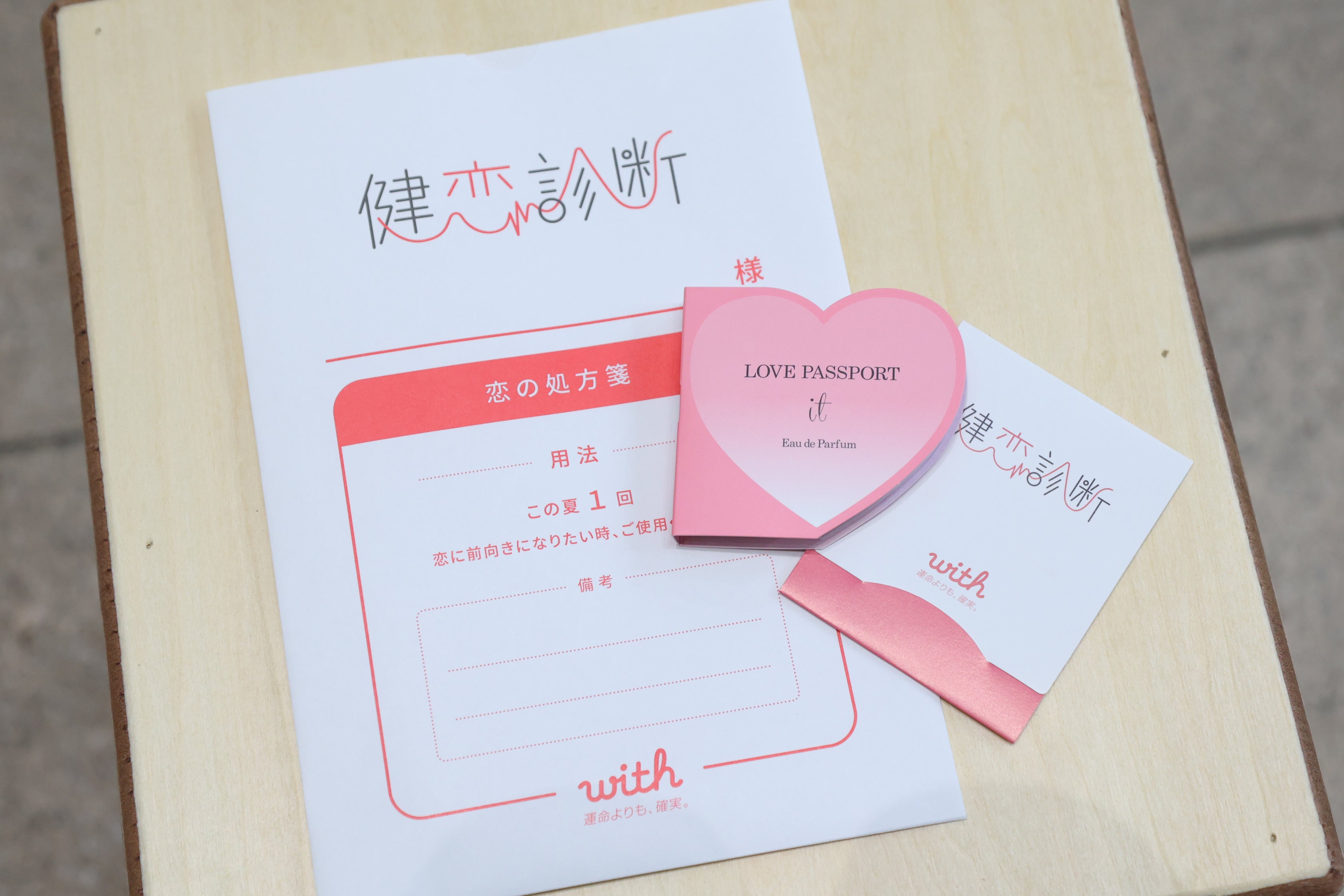 本イベントでは、診断結果と合わせて、この夏あなたの恋をちょっと前向きにする恋愛アイテム 「恋の処方箋」をプレゼントいたします。恋に前向きになれる香りの【香水】と「健恋診断」にちなんだ【オリジナルアイテム】が同封されています。※なくなり次第終了。
