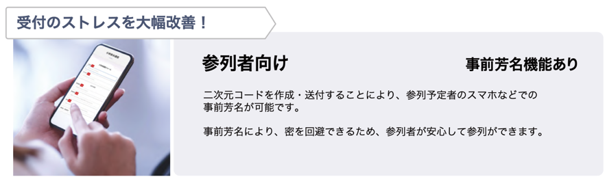 さらに、近年のコロナ感染の現状を踏まえ、参列者にスマートフォン上での事前芳名を促すことで、芳名参列をせずに入場できるため、密を防ぐことができます。