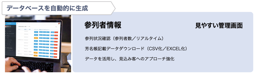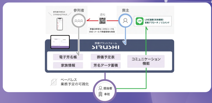葬儀のデジタル化を推進し、喪主・参列者・葬儀会社の三者が効率的につながるソリューションです。 従来からの紙資料を削減し、ペーパレス化を推進すると同時に、顧客データの蓄積・分析が可能となっており、潜在顧客の発掘を支援します。