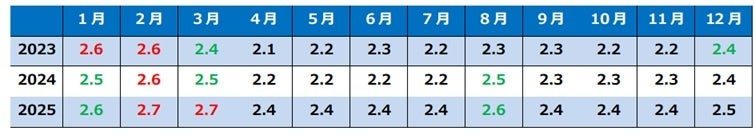 赤字は年間で最も高い数値、緑字は2番目に高い数値を示しており、12月から3月にかけて高い数値が集中していることが分かります。