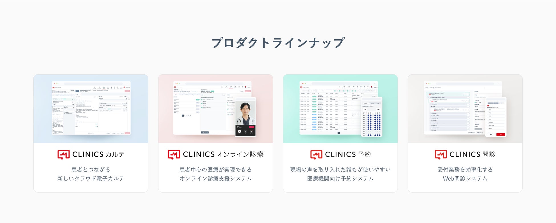「CLINICS」は、製品の大幅アップデート、新製品の提供、新規オプションの追加により、「予約・問診・診察・会計」といった診療プロセス全体を、ワンストップで効率化できるソリューションとなりました。