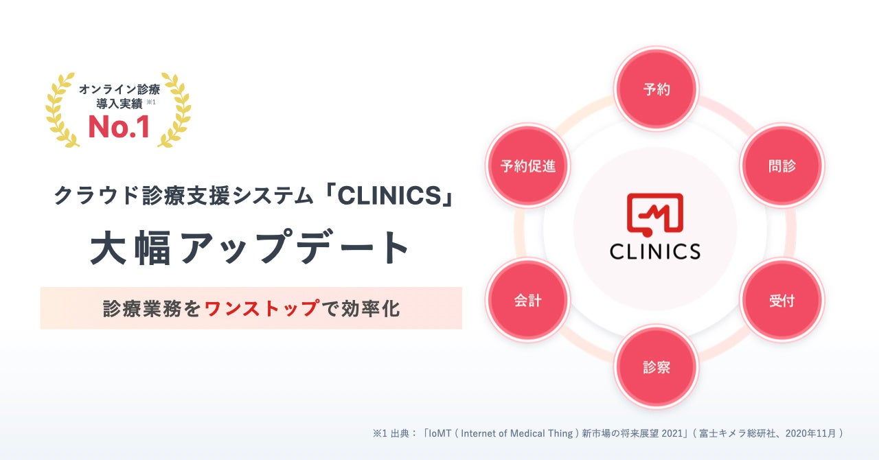 株式会社メドレー(以下、メドレー)は、クラウド診療支援システム「CLINICS(クリニクス)」を大幅にアップデートし、予約から会計までの医療機関の診療業務全体をワンストップで効率化できるソリューションとして、2022年8月1日より提供を開始しました。本アップデートにより、「CLINICS」は、対面診療/オンライン診療を問わず、「予約・問診・診察・会計」がシームレスに繋がった診療体験を患者に提供し、医療機関と患者の外来診療にまつわる非効率さの解消に貢献します。