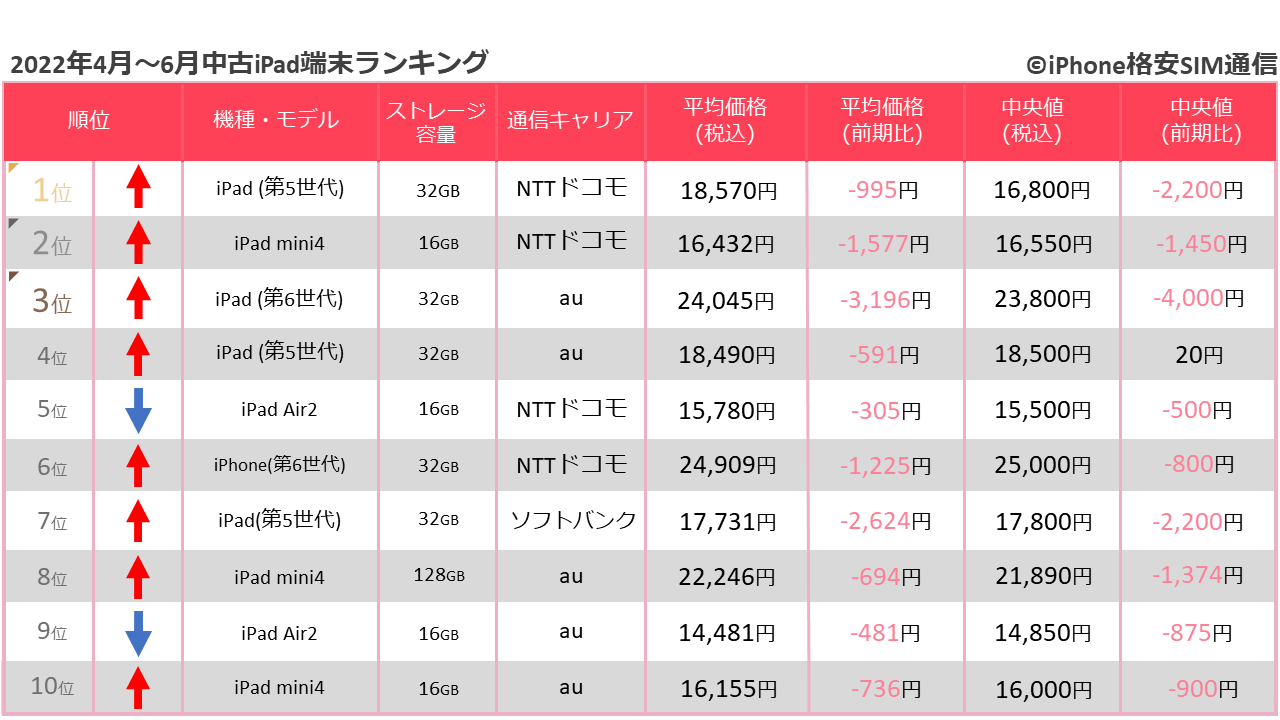 前回の調査(2022年1月~3月)では取引数が減少となったiPadでしたが、今回の調査では前回より9.2%増加となりました。1位は、順位を塗り替えランクインしたiPad(第5世代)。平均価格が16,000円前後と手頃で中古市場での取引が好調です。iPad mini 4も取引は活発ですが、6月の開発者会議「WWDC 2022」でサポート対象外になるという発表があったため、今後は取引数に大きく影響が出てくると見ています。