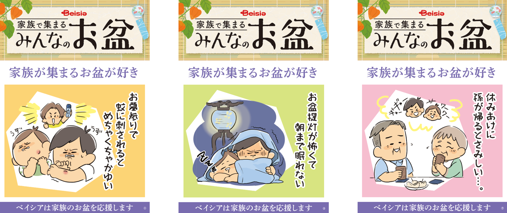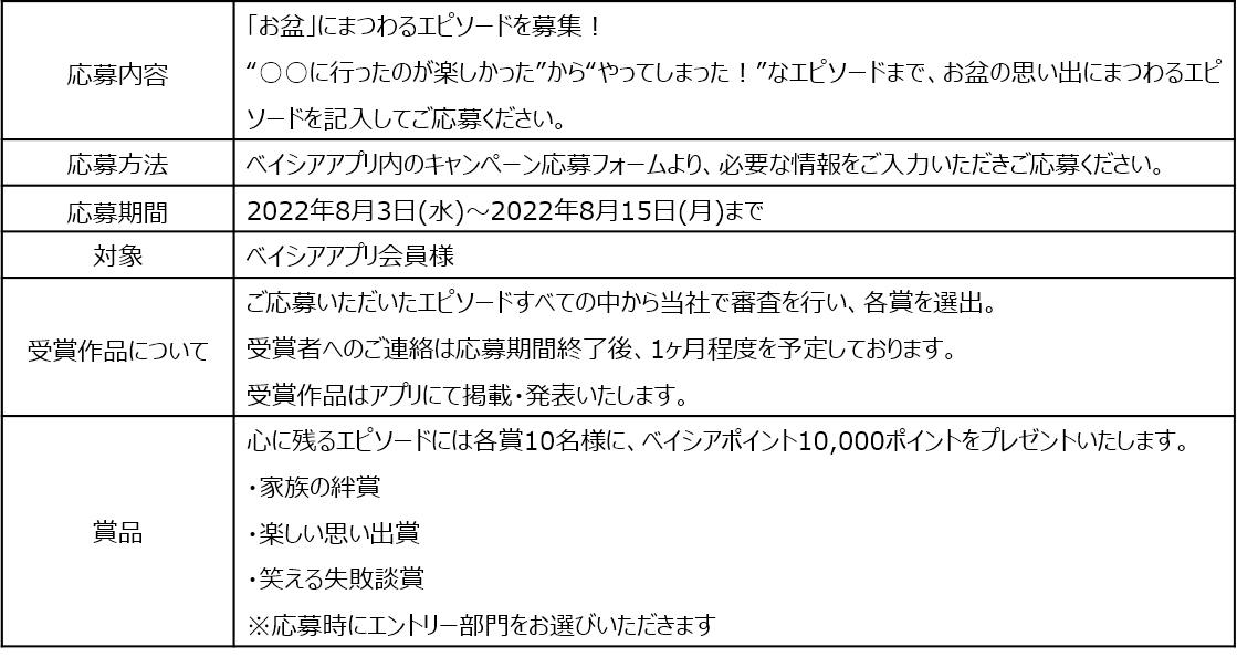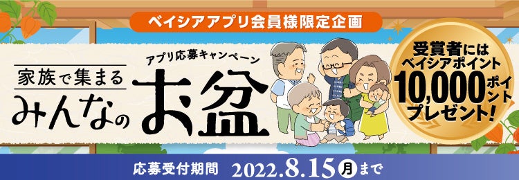 株式会社ベイシア(本社:群馬県前橋市、代表取締役社長:相木孝仁)は、8月3日(水)~8月15日(月)の期間で、「家族で集まるみんなのお盆」と題して、「お盆」にまつわるエピソードをベイシアアプリ内で募集いたします。ご応募いただいたエピソードの中から心に残るエピソード各賞を選出し、賞品としてベイシアポイントをプレゼントいたします。また店内各所ではお盆の日常の一コマをイラストでご紹介いたします。ご家族でお盆の思い出を振り返ってみてはいかがでしょうか。