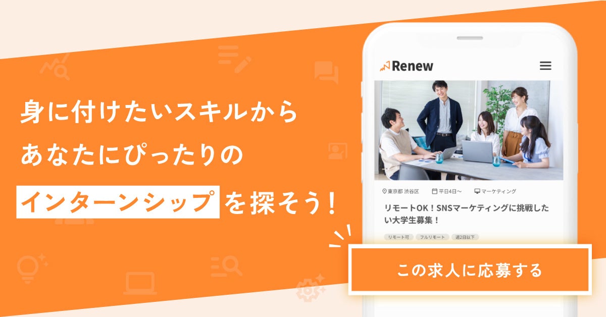 Renewは、キャリアを考える学生と、学生の力を信じている企業をつなぐ、就業型に特化したインターン募集サイトです。身につけたいスキルや、仕事内容からインターン先が探せるから 就職活動に活きる経験ができます。職種、勤務地、業界、こだわりの働き方、身に付くスキルなど、希望条件にマッチしたインターン検索が可能です。