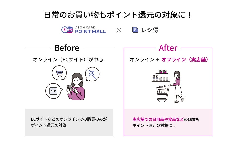 これまで「イオンカードポイントモール」では、主にECサイトなどのオンライン利用をポイント還元の対象としていましたが、このたび『レシ得』を導入することで、ご近所のスーパーマーケットやドラッグストアなど「実店舗(オフライン)」での購買も新たにポイント還元の対象に加わります。