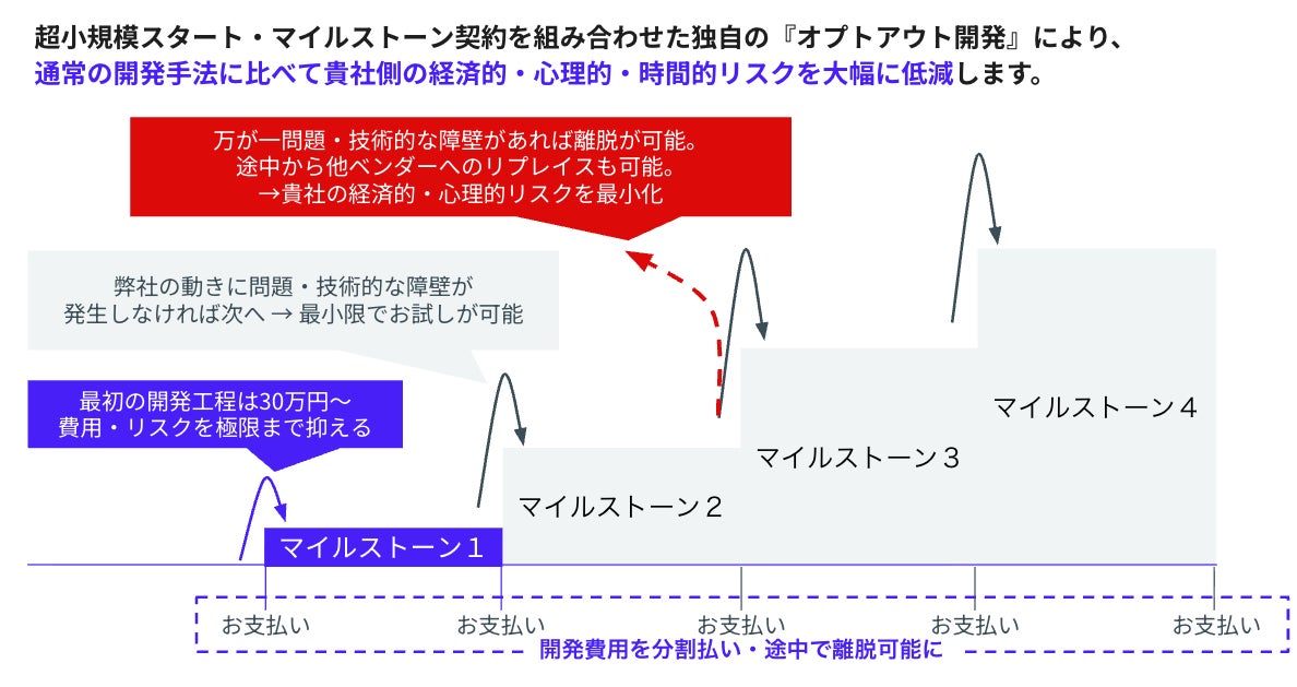 『オプトアウト開発』は、「低予算から始めやすい、超小規模スタート」と「途中で引き返しやすい、マイルストーン型契約」を組み合わせた当社独自の開発手法です。