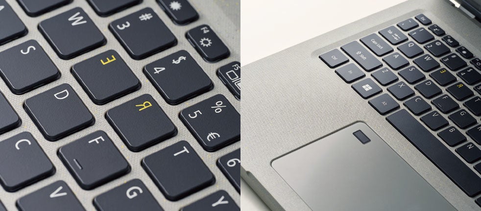 製品ボディは環境に配慮した無塗装のシンプルなボルケーノグレーカラーにイエローのアクセントカラーを効かせた、ユニークで洗練されたデザインに仕上げました。キーボードの「R」と「E」のキーは、Reduce、Reuse、Recycleを象徴するようにイエローの差し色をアクセントとして施しています。また、キーボードキャップに50%、トップ・ボトム・スクリーンベゼル・操作面に30%のPCRプラスチックを採用しています。
