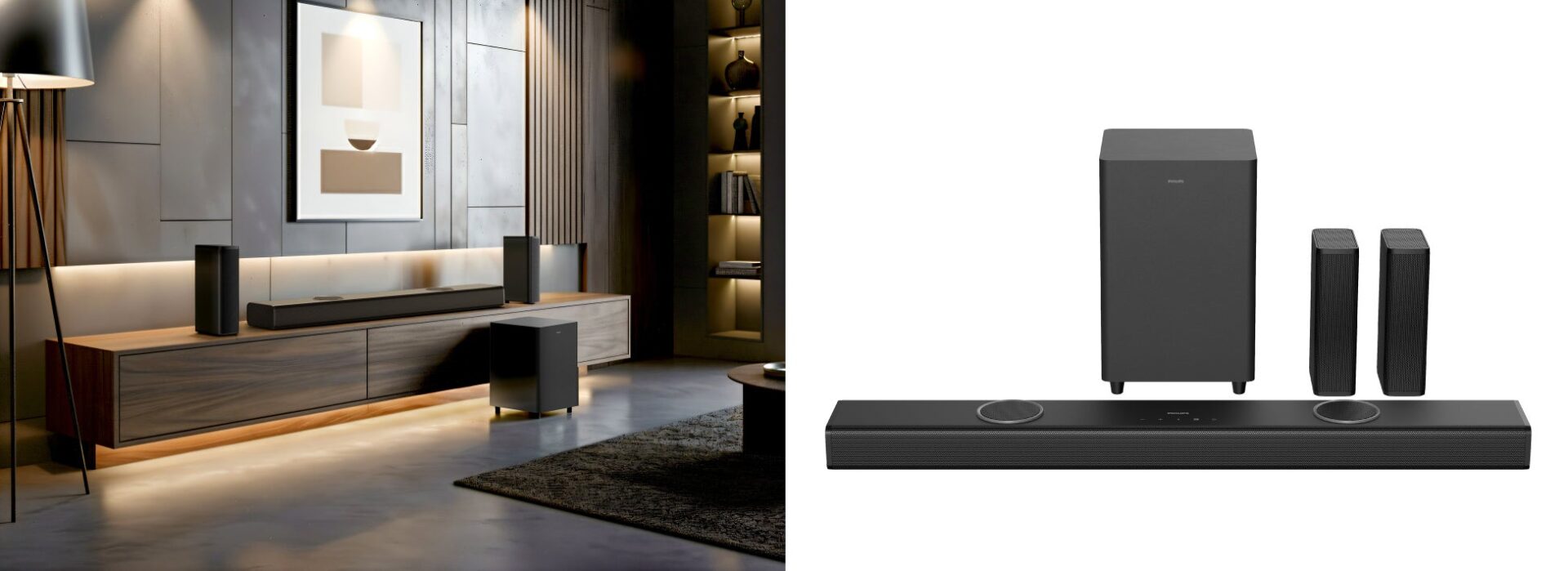 PHILIPS初の物理スピーカーによる7.1.4ch対応サウンドバー。煩わしい設定は不要で電源を繋げるだけでスピーカー同士が自動でペアリング。