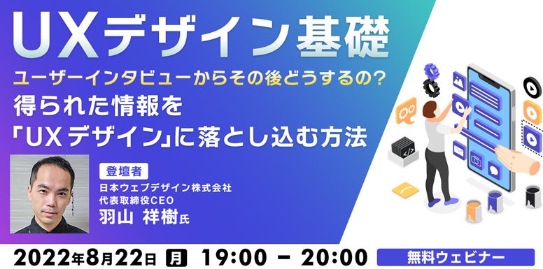 製品・システム・サービスなどの利用を通じたユーザーの体験を意味するUX(ユーザーエクスペリエンス)。UXデザインとは、それらの体験を設計することを指す言葉です。セミナーシリーズ「UXデザイン基礎」では、UXとつながりの深い「人間中心設計」(HCD)の専門家でもある羽山 祥樹氏に講師としてご登壇いただいております。