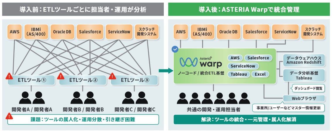 同社では、会計システムをはじめとする業務システム間のデータ連携やデータ活用を目的とした分析基盤の構築においてETL※2ツールを活用していました。しかし、用途ごとに3種類のETLツールをバラバラに使っていたため運用が複雑化。また、担当者にはプログラミングの専門知識が必要になることから学習コストが重く、その結果として属人化が進行していました。さらに、ETLツールの1つが保守期限を迎えることを契機に、今後のシステム拡張やDX推進を見据えた、データ連携基盤の抜本的な見直しが急務となっていました。